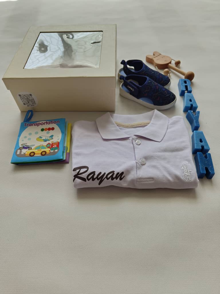 این گیفت باکس شامل یک عدد کفش، یک تی شرت با امکان حک اسم، یک عدد شمع اسم، یک طبلک چوبی با امکان حک اسم و یک عدد کتاب پارچه ای انگلیسی میباشد.